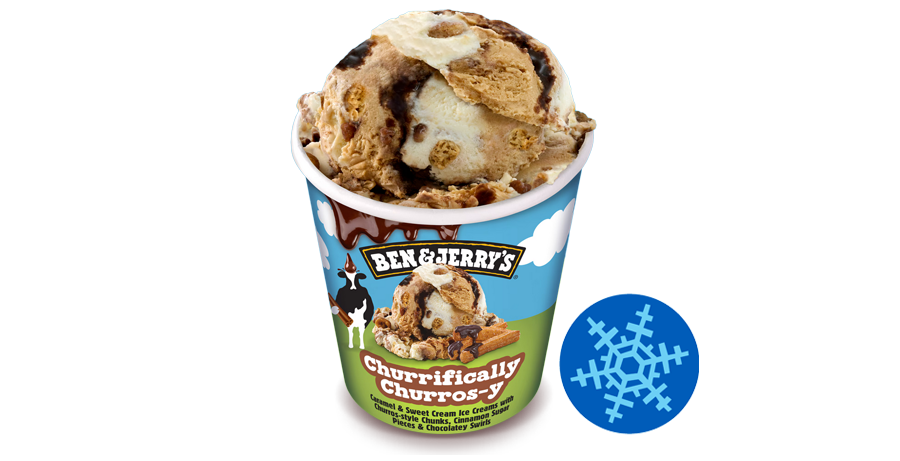 Karamell-Eiscreme mit Keksstückchen, Churro-Geschmack und Zimt-Zucker-Stückchen, durchzogen von Schokoladensauce